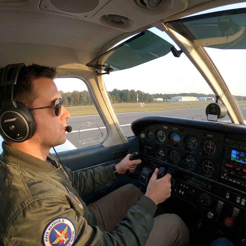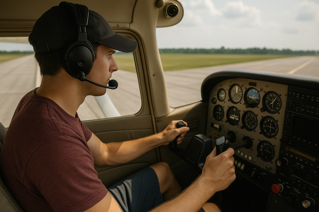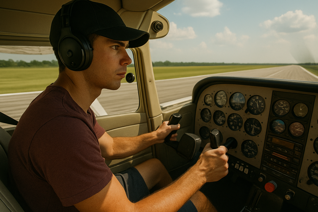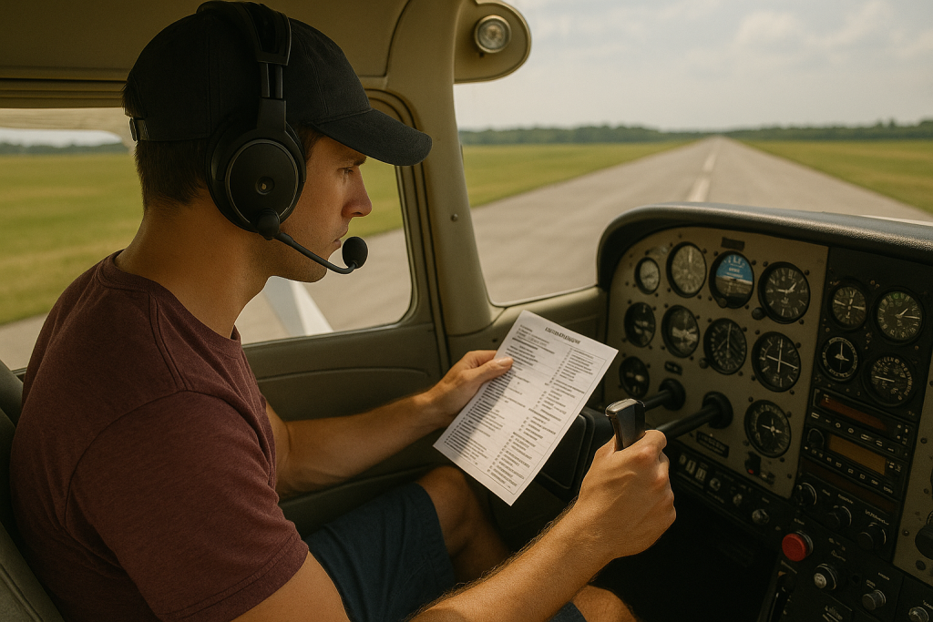 This quick-but-critical step is the last pause before committing to high-speed ground movement. You check your mixture is rich, fuel pump on if required, transponder set to ALT, lights on, doors and windows secured, and the DG aligned with the runway heading. You apply a firm hold on the yoke and remind yourself of the takeoff abort plan: What will you do if something suddenly sounds or feels wrong? This moment teaches discipline. Pilots who build this habit early carry it into every phase of their training — and every solo flight — with confidence.